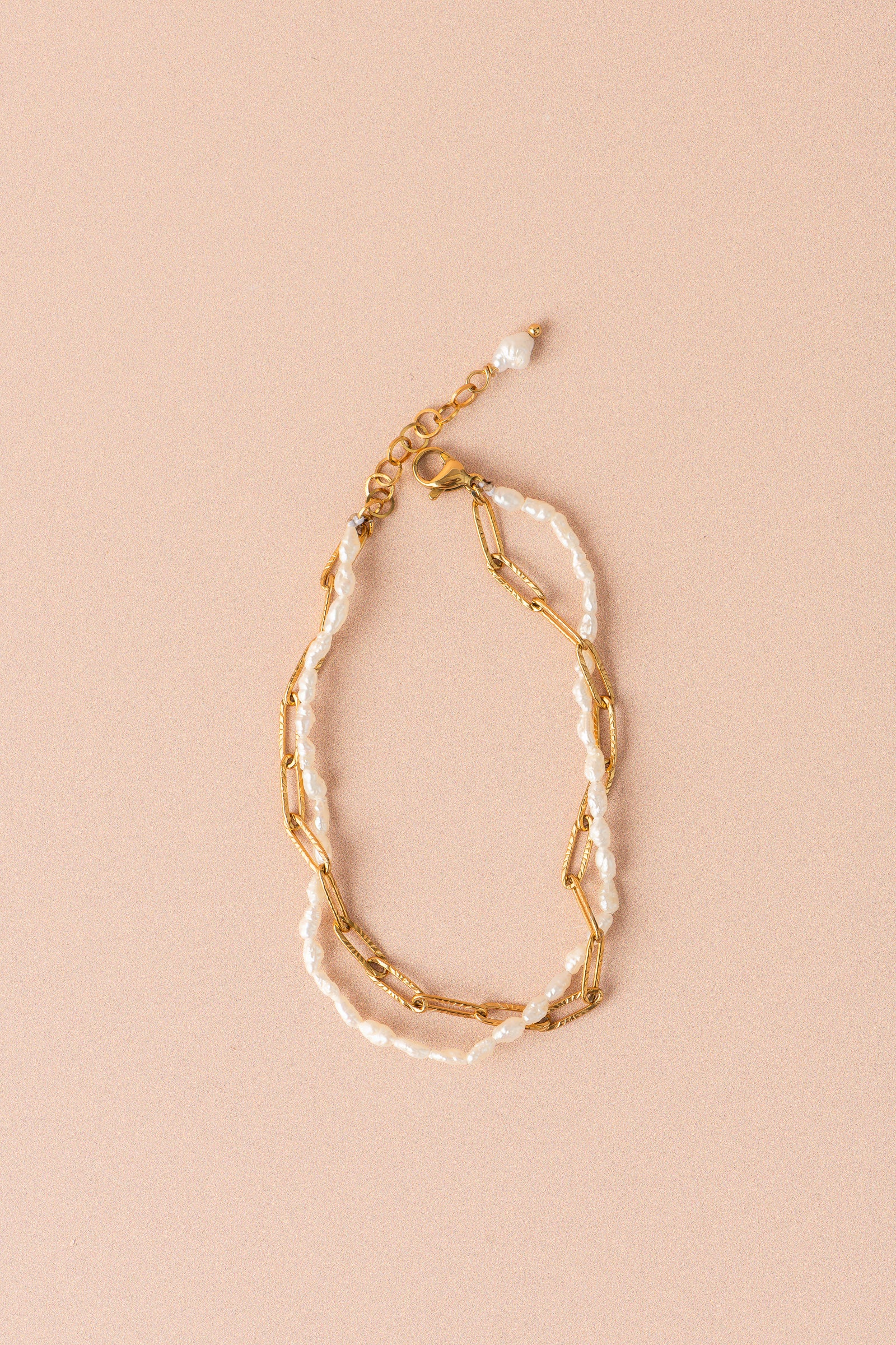 Il bracciale Gea è realizzata con filo di perle di fiume e catena in acciaio inossidabile dorato.