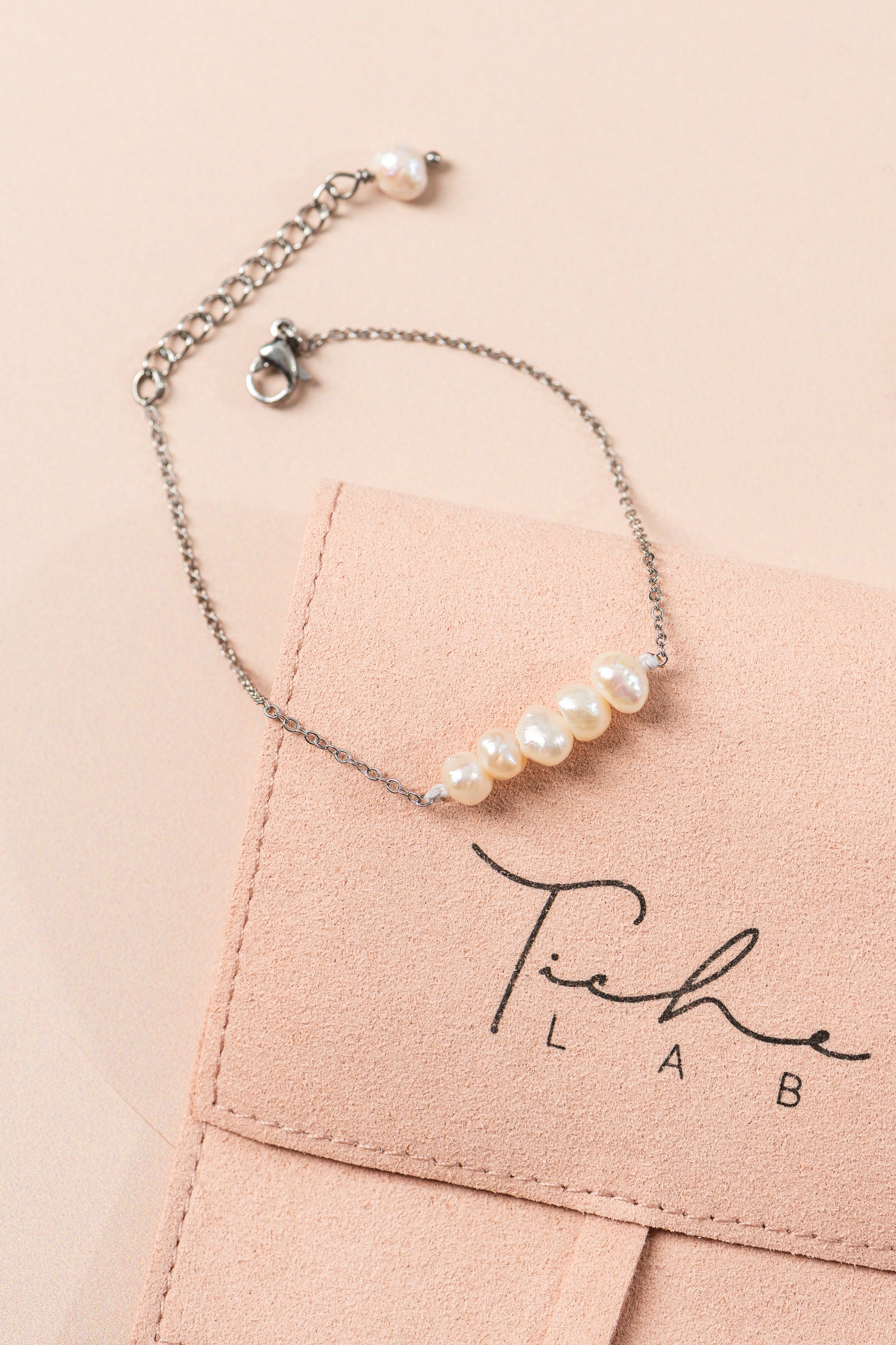 Il bracciale Temi è realizzato con catena in acciaio inossidabile e perle di fiume.