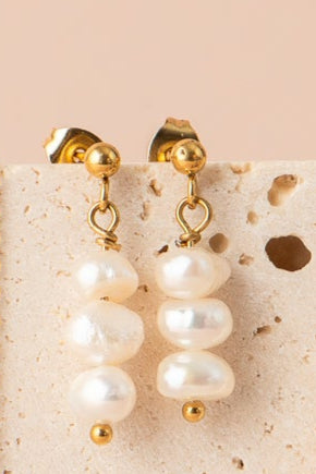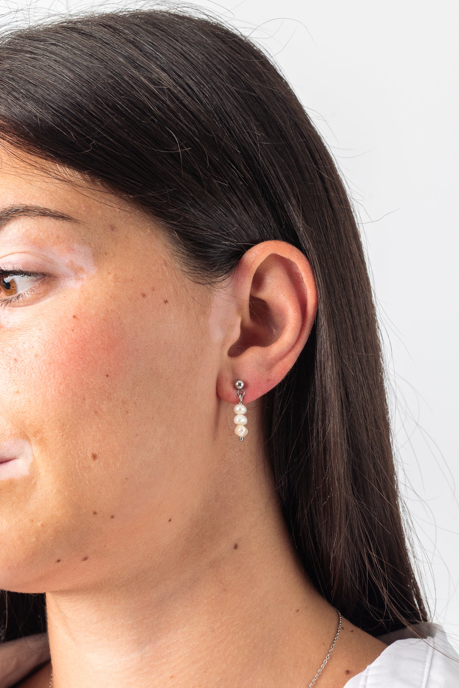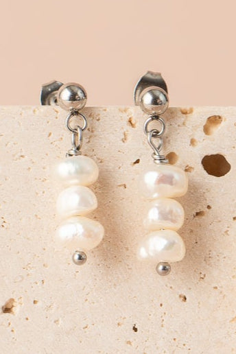 Gli orecchini Temi sono realizzati in acciaio inossidabile con tre perle di fiume pendenti.