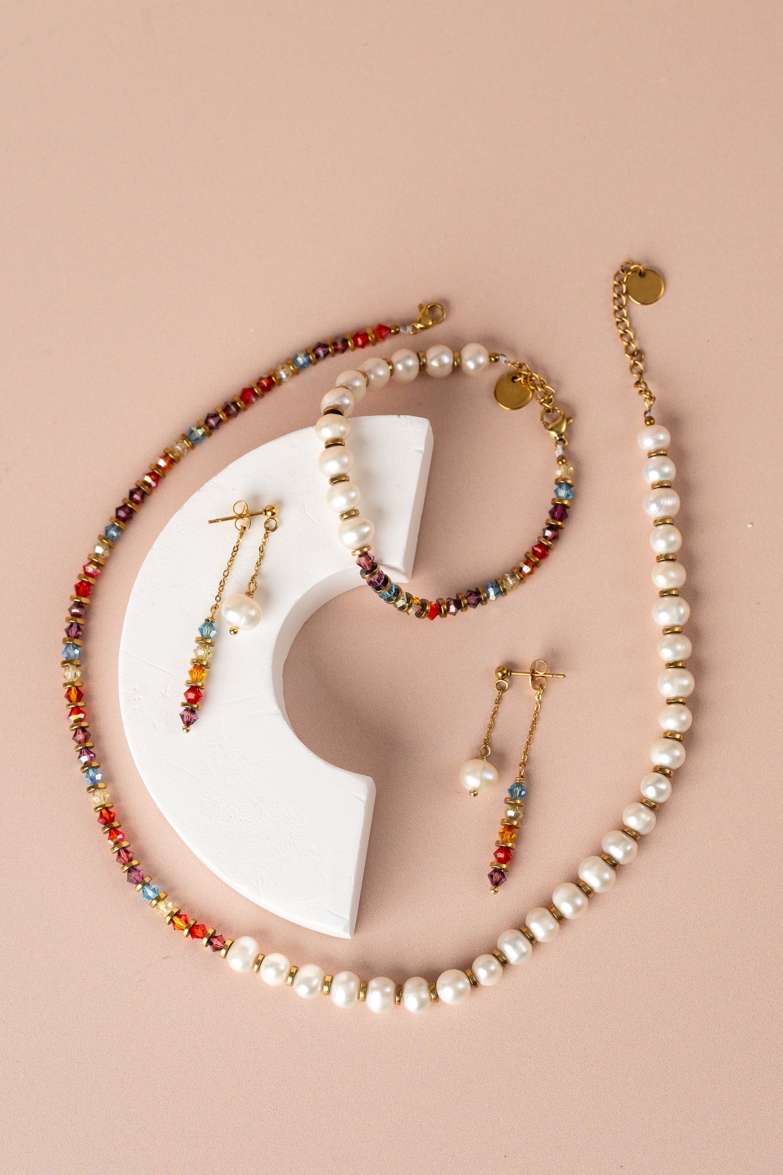 La collana Afrodite è realizzata con Swarovski multicolor, ematite dorata e perle di fiume.