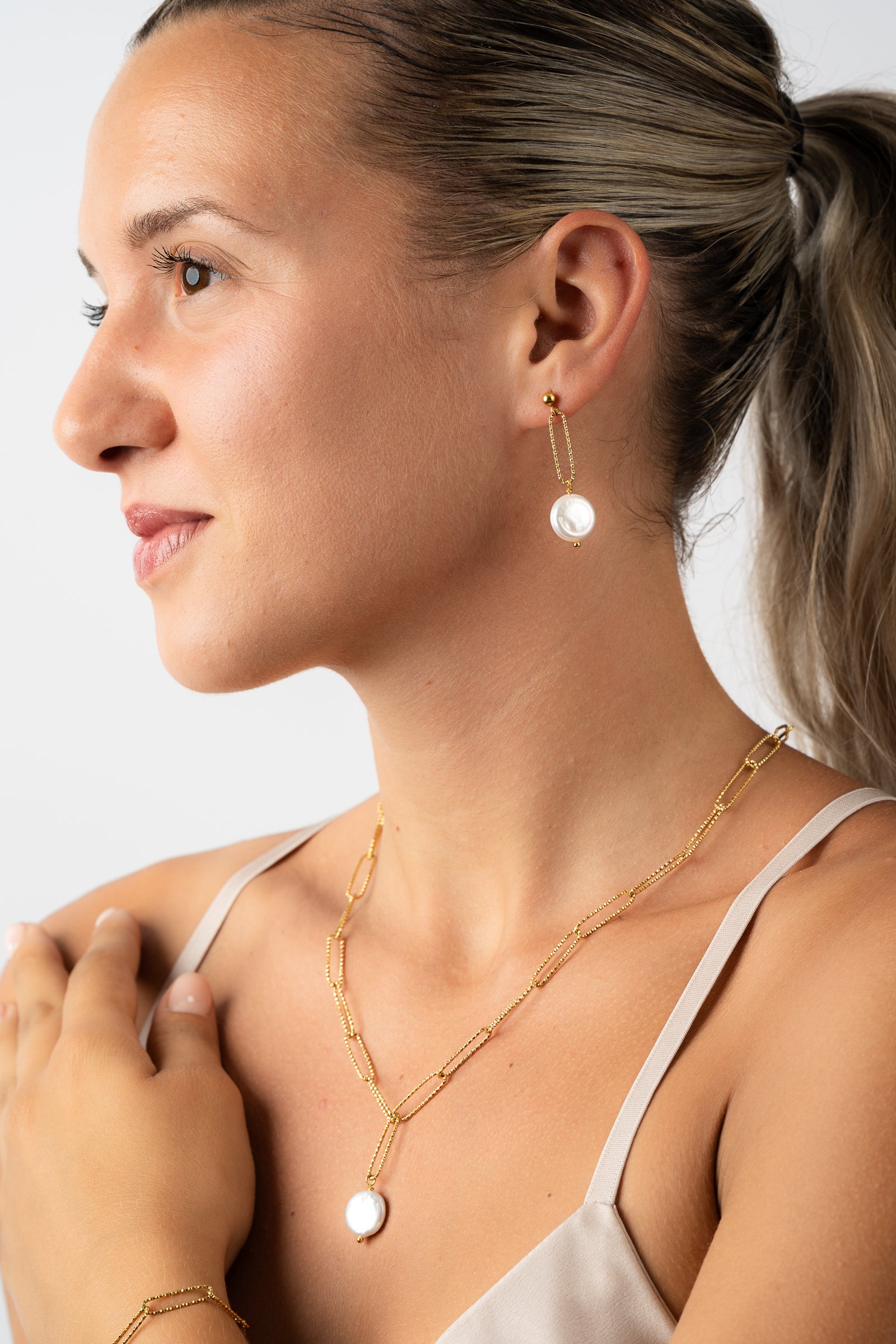 La collana Armonia è realizzata con una catena in acciaio inossidabile e perle di fiume.
