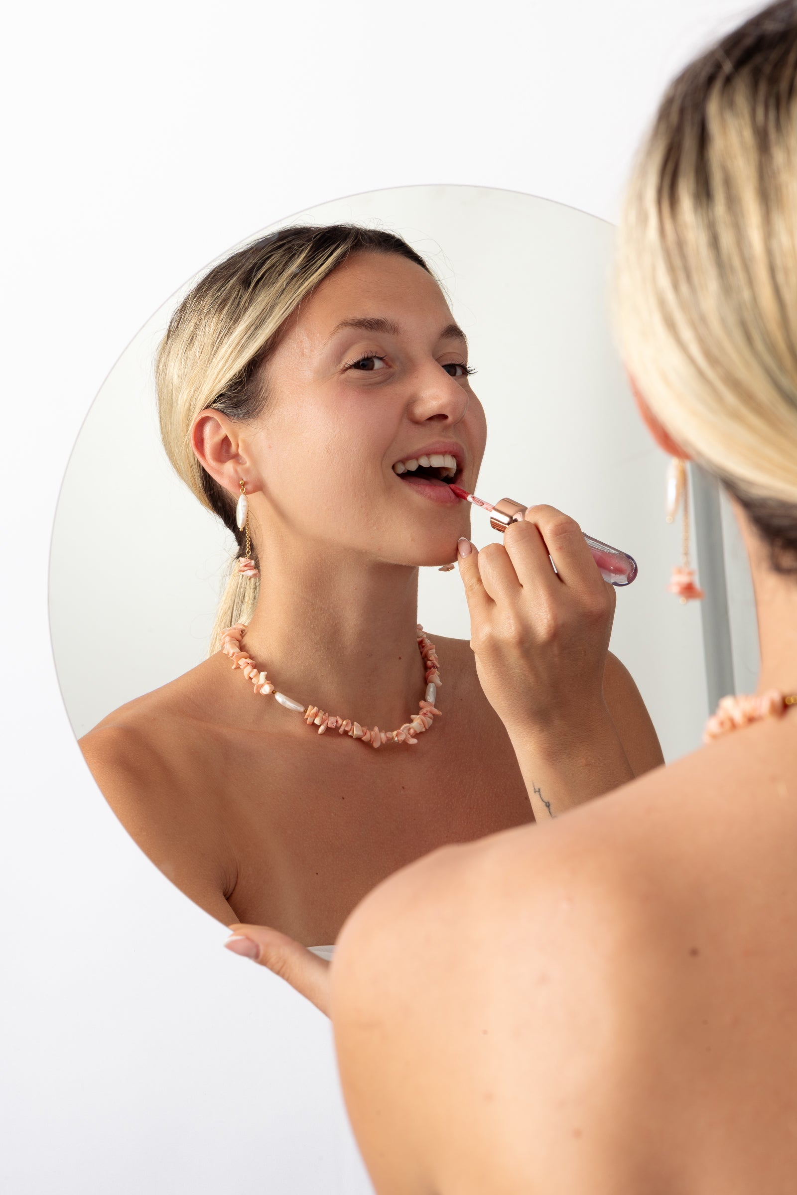 La collana Peitho è realizzata con conchiglie rosate, perle di fiume e ematite.
