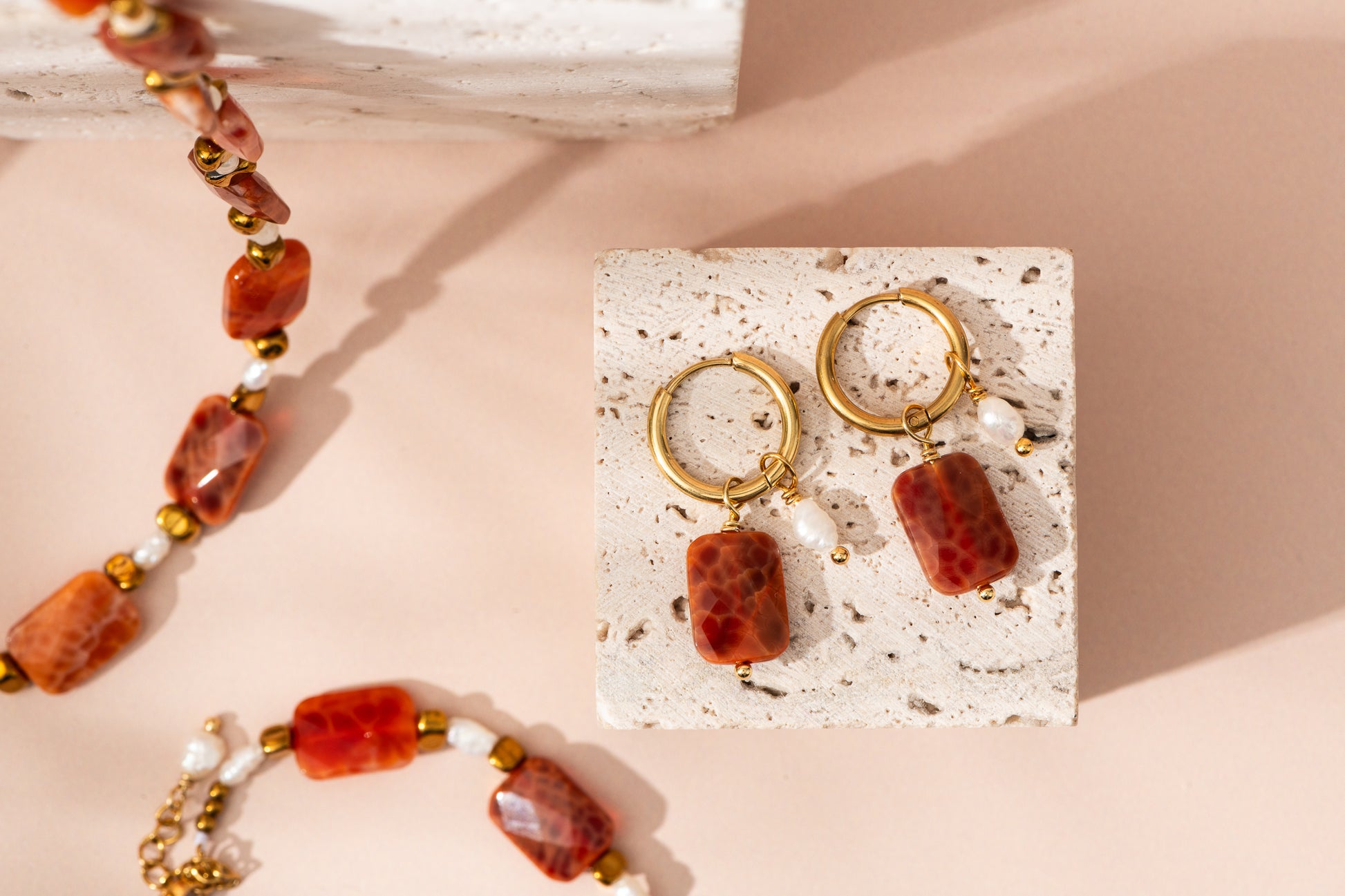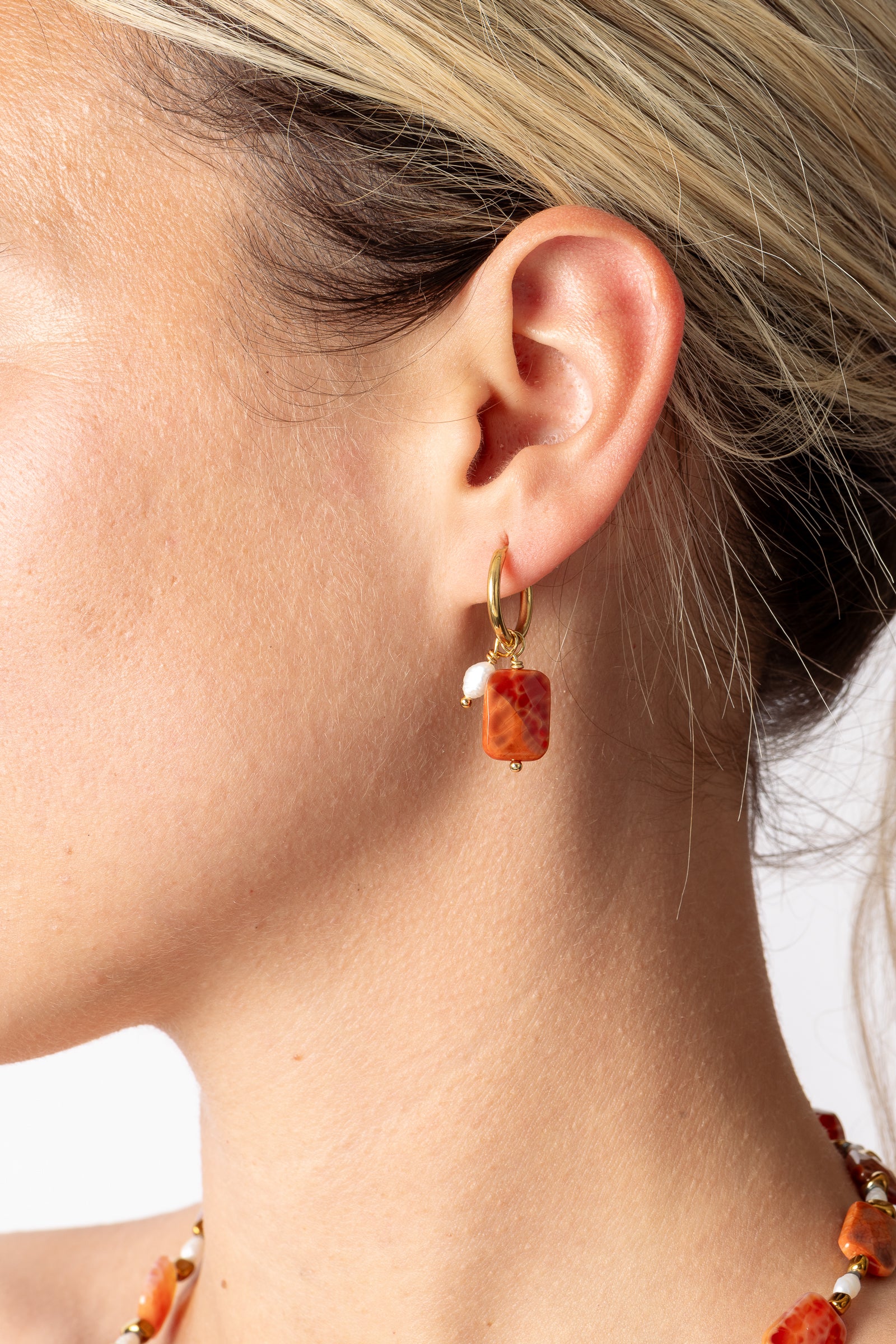 Cerchio liscio di 1,3 cm di diametro e pendente con perla di fiume e corniola.