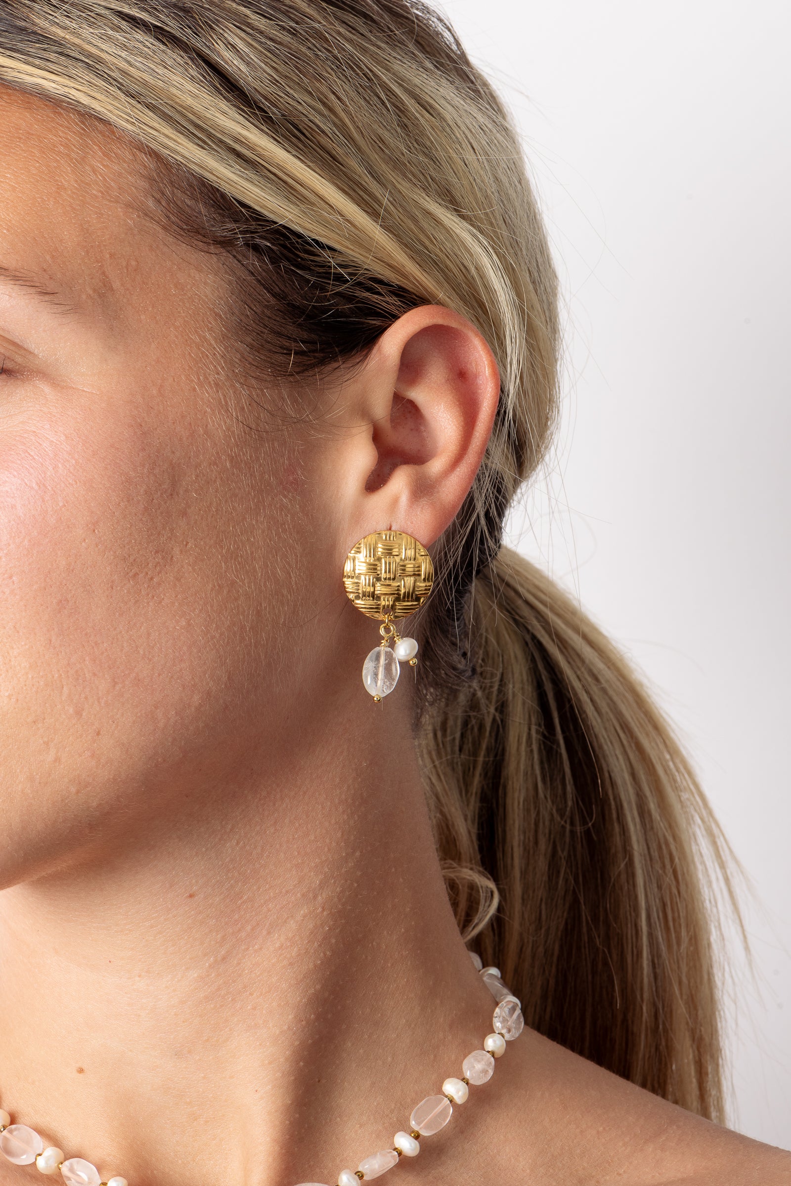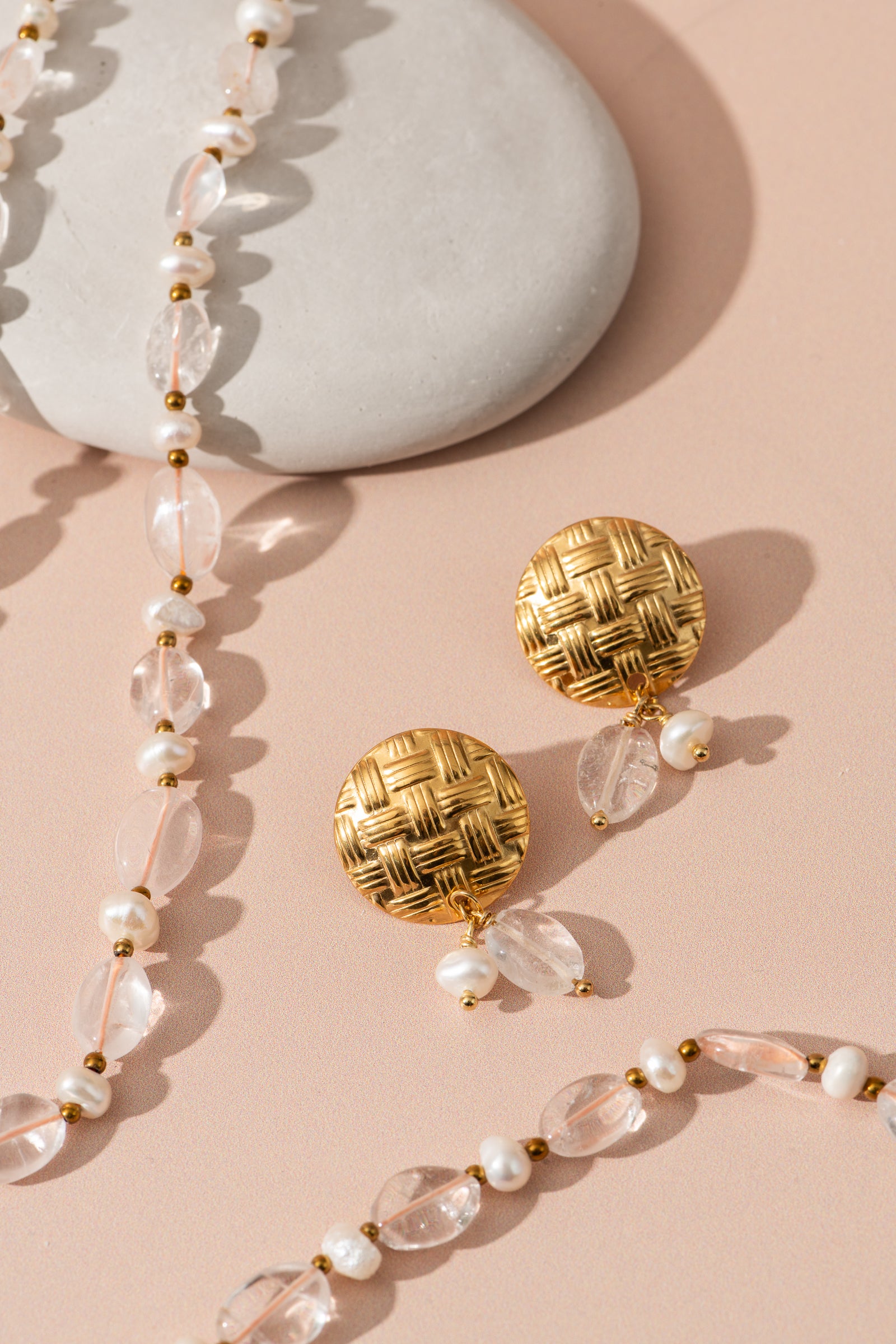 Orecchini a lobo in acciaio inossidabile dorato con texture intrecciata, arricchiti da una composizione pendente di cristallo di rocca e perle di fiume.