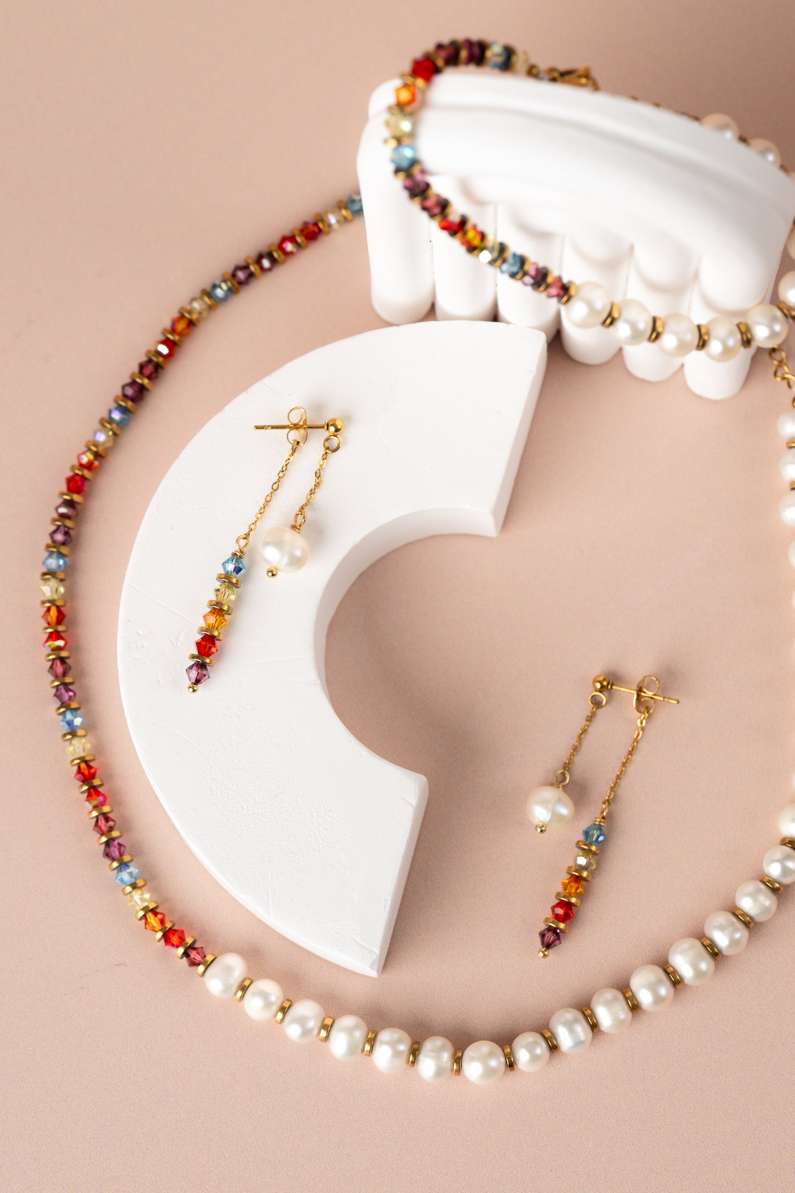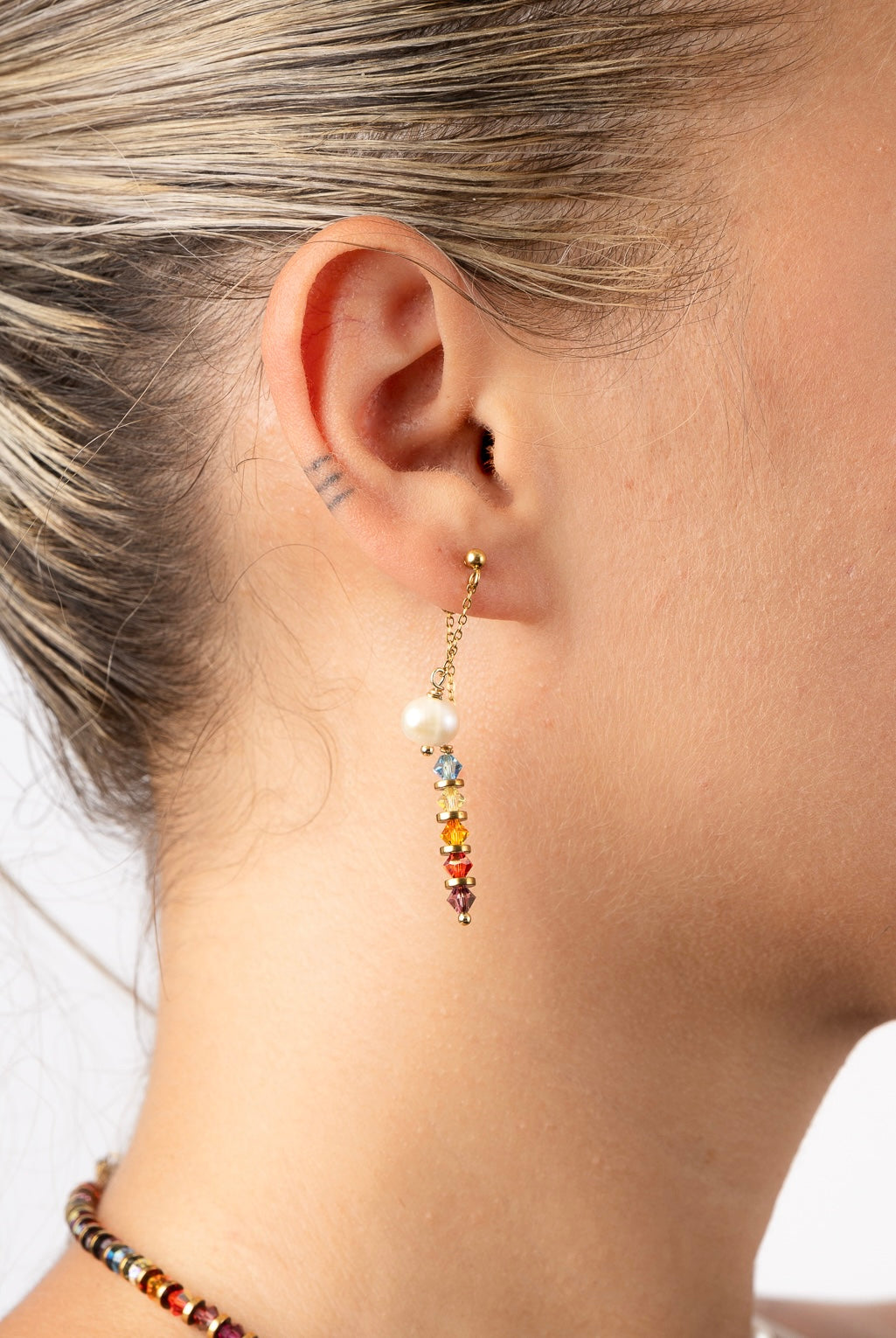 Gli orecchini Afrodite sono realizzati in acciaio inossidabile con Swarovski multicolor, ematite dorata e perle di fiume.