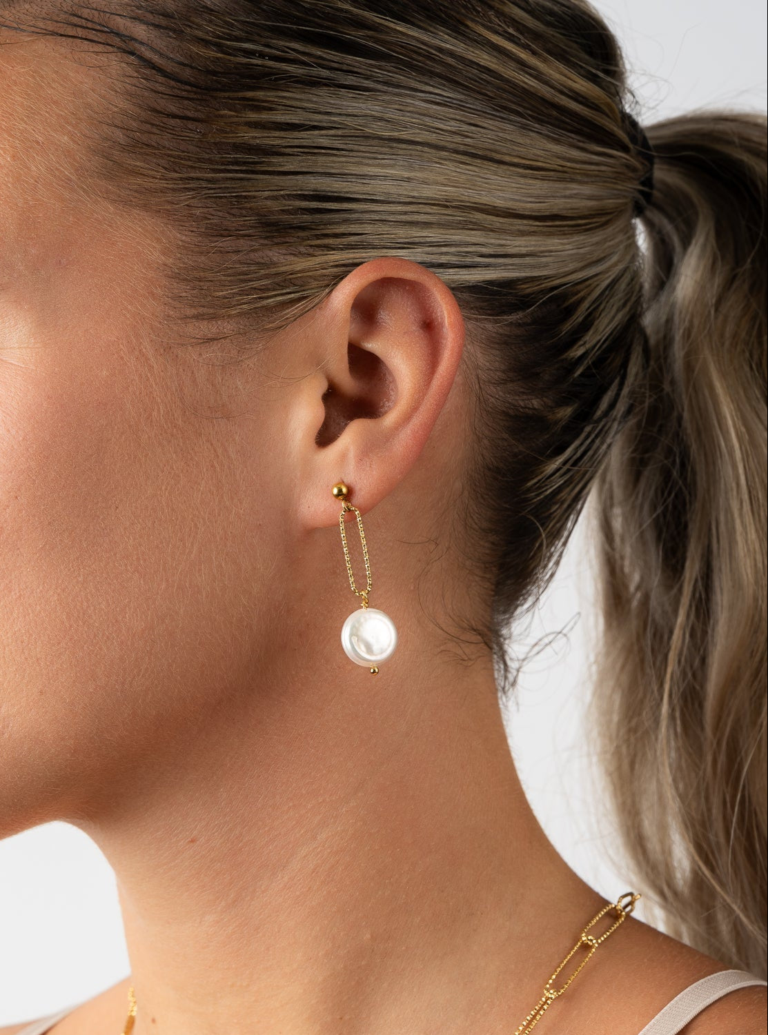 Orecchino a lobo pendente con perla piatta tonda di circa 2 cm.