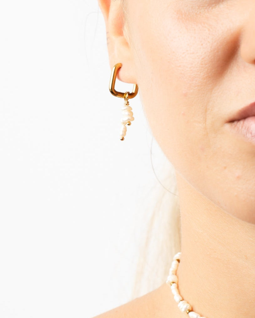 Cerchio quadratino liscio di 1,8 cm di diametro e due pendenti con perle di fiume.