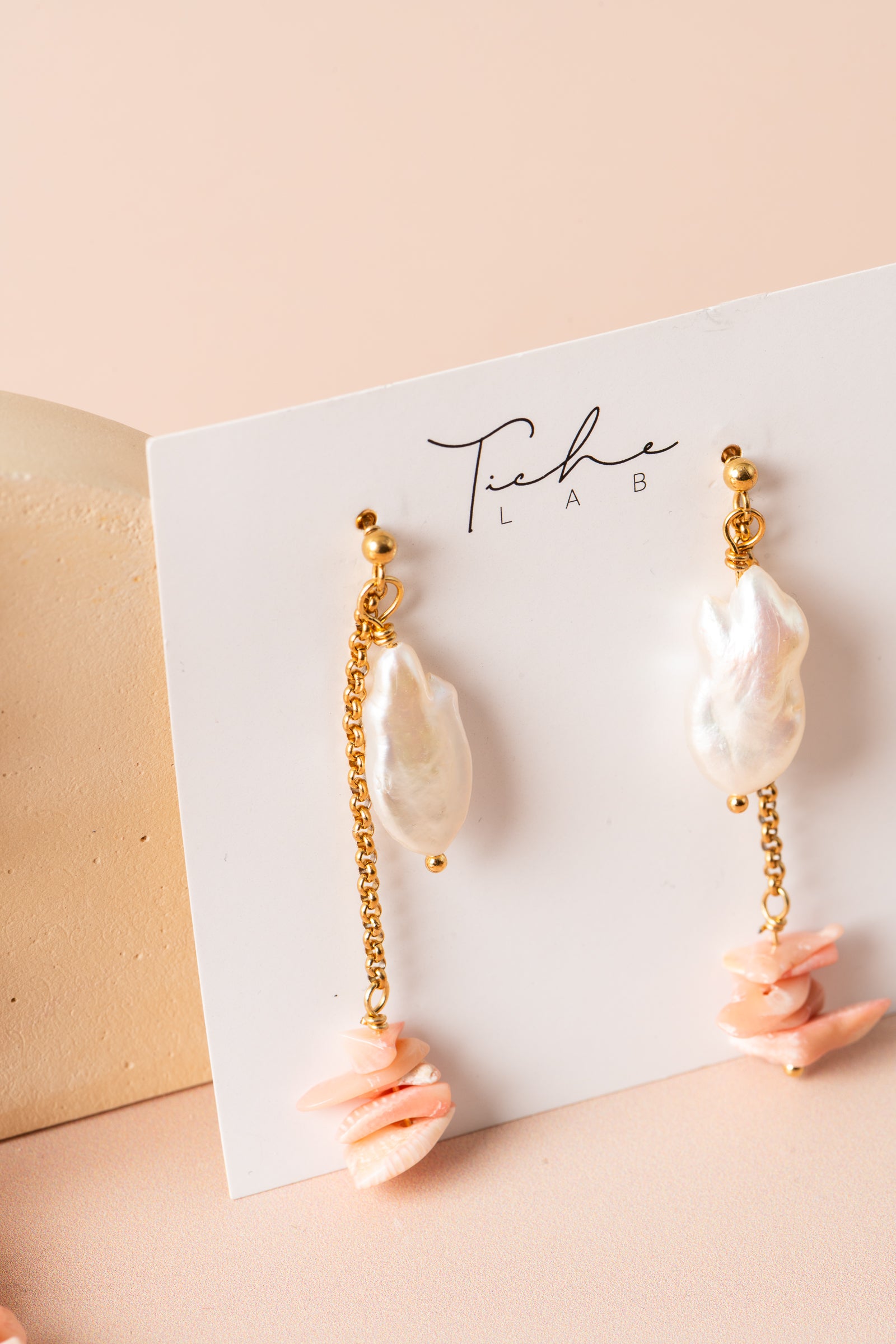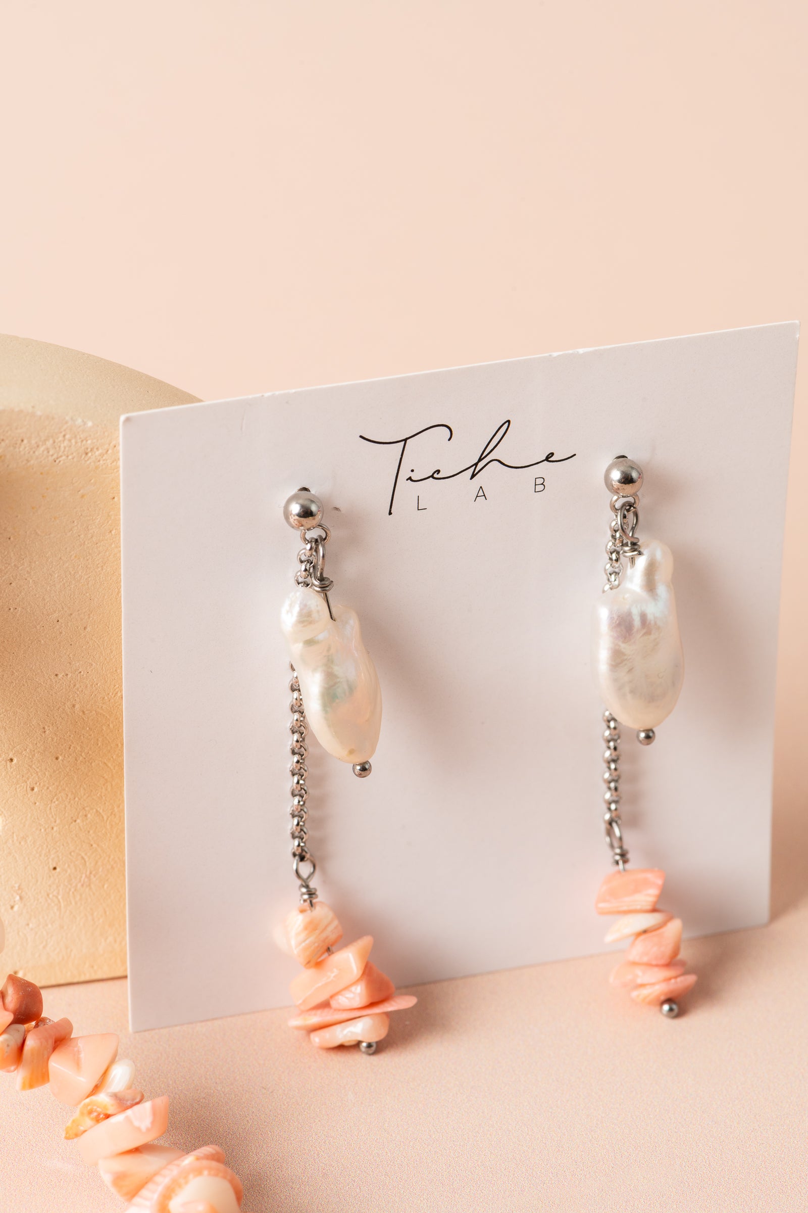 Orecchino a lobo pendente con perla piatta tonda di circa 2 cm e catena in acciaio con conchiglie di circa 5 cm.